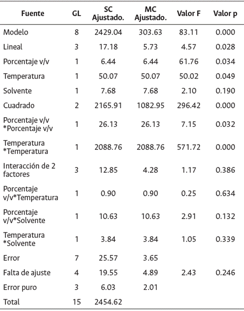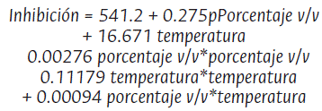 Tabla 1: Análisis de varianza de superficie de respuesta: inhibición vs. porcentaje v/v; temperatura; solvente