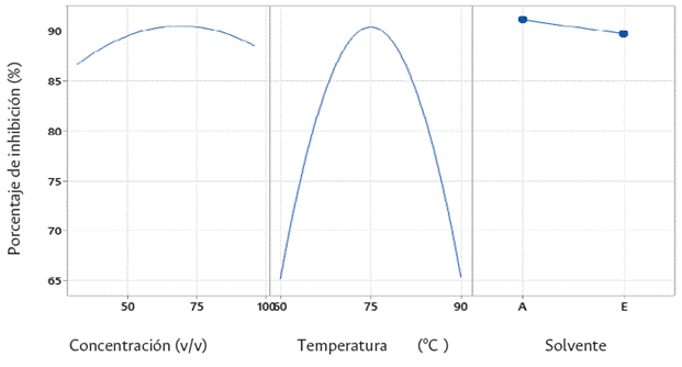 Las gráficas de contornos (Figura 3) permiten observar el efecto de la concentración de los solventes y la temperatura. Se puede evidenciar que el porcentaje de inhibición para ambos solventes presenta comportamientos similares en relación con rangos de temperatura entre 70 y 80 °C; la mejor fue de 75 °C. Beltrán et al. (2013) indican que a medida que la temperatura se eleva sin superar excesos, es posible mejorar la velocidad de extracción, lo que simplifica la transferencia de los compuestos desde la estructura vegetal hacia el solvente. Respecto a la concentración, se evidencia que para el solvente acetato de etilo el rango óptimo es de 62 v/v y para el caso del solvente etanol, estos valores difieren entre 50 a >90 v/v. El etanol y el agua destilada forman un complejo de solventes polares en los cuales pueden disolverse diversos solutos polares e iónicos, incluyendo proteínas, carbohidratos y sales minerales. Por su parte, solventes dipolares como el acetato de etilo presentan una polaridad intermedia y pueden solubilizar solutos de polaridad relativa similar (Beltrán et al., 2013).