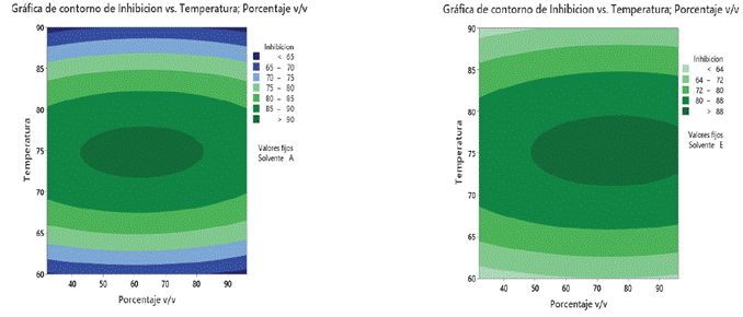 Figura 3: Gráficas de contorno de inhibición de solvente A y E con temperatura vs. porcentaje v/v.