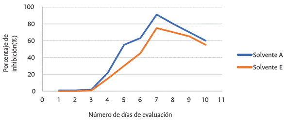 Figura 5: Dinámica de inhibición del patógeno frente a los solventes.
