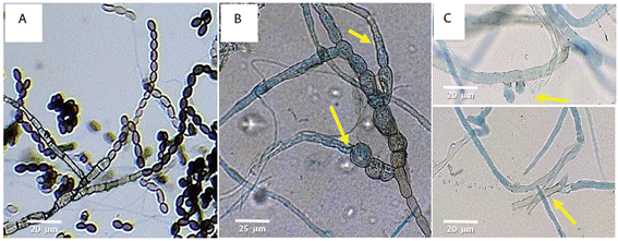 A nivel de laboratorio, después de la siembra del patógeno, se observó que el efecto inhibitorio de los extractos de C. frutescens se redujo al séptimo día de evaluación (Figura 5); por lo que se realizaron réplicas de M. roreri cada 7 días en PDA con el mismo tratamiento, tomando las cepas que previamente habían sido sometidas al tratamiento. Al cabo de 28 días se observó pérdida de capacidad de crecimiento y multiplicación. A nivel microscópico, en la estructura micelial (Figura 6A), se evidenció que a los 7 días del tratamiento las estructuras reproductoras de M. roreri se vieron afectadas dado que los conidióforos de las hifas perdieron la capacidad de alargarse para formar los conidios (Figura 6B). A los 14 días de evaluación, se notó rotura de la membrana y de la pared celular del fitopatógeno, lo que generó pérdida del protoplasma, malformación de las hifas y ausencia de conidiósporas (Figura 6C). Lo anterior permite establecer que, en caso in vitro, el efecto inhibitorio del extracto obtenido con el solvente acetato de etilo requiere de una aplicación cada 7 días por mínimo 21 días para lograr su máxima eficacia.