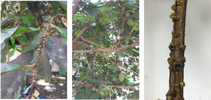 Figura 1: Sintomatología de Ceroplastes floridensis sobre hojas, ramas y tallos en cultivos de guayaba agria.