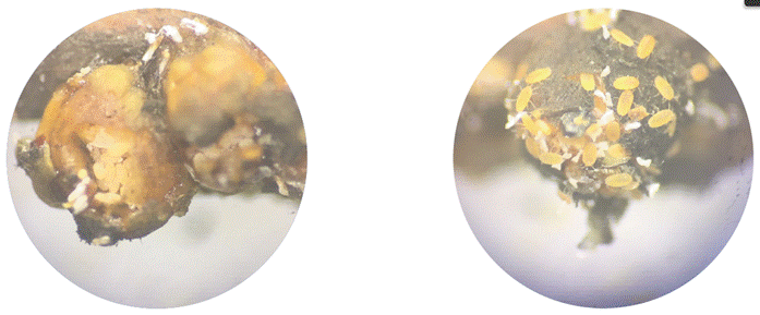 Figura 2: Masa de huevos de Ceroplastes floridensis protegidas dentro del ovisaco, y emergencias de ninfas en cultivos de guayaba agria.