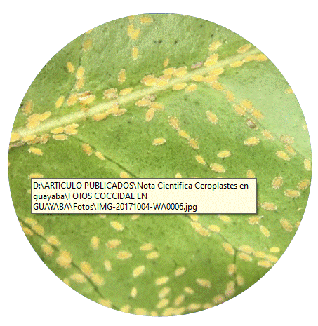 Figura 3: Ninfas de Ceroplastes floridensis ubicadas en el haz de las hojas en cultivos de guayaba agria.