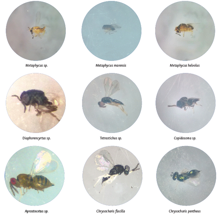 En lo que respecta a los parasitoides, las especies identificadas fueron Metaphycus sp.; Metaphycus marensis; Metaphycus helvolus; Diaphorencyrtus sp.; Copidosoma sp.; Chrysocharis flacilla; Chrysocharis pentheus; Tetrastichus sp., Aprostocetus sp. (Figura 4).