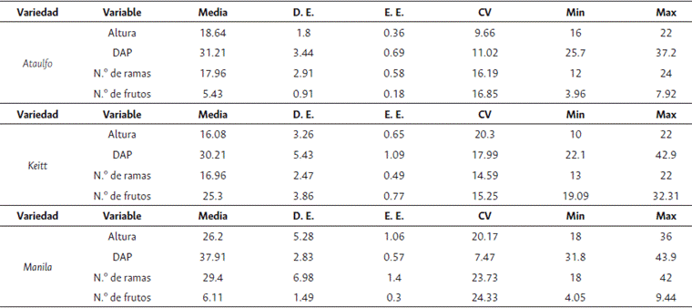 Las características dendrométricas de las variedades de mango variaron inter e intravariedades. La variedad Manila presentó una altura de 26.2 ± 5.28 m, que superó a las variedades Ataulfo y Keitt. El DAP varió de 30.21 ± 5.43 cm en Keitt a 37.91 ± 2.83 cm en Manila, y fue la variedad Manila la que presentó el mayor número de ramas, Ataulfo el menor número de frutos y Keitt la mayor cantidad de estos (Tabla 1).
