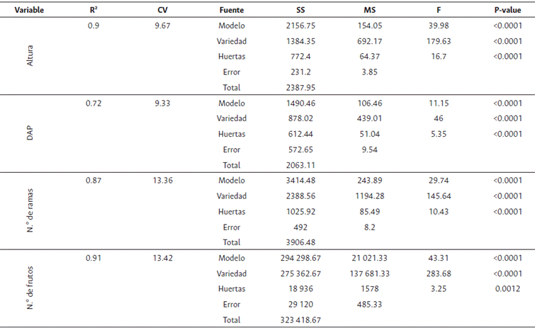Las variables dendrométricas presentaron una distribución normal (prueba de Shapiro-Wilks: altura= 5.68, P= 0.91; DAP= 5.28, P= 0.96; n.° de ramas= 7.27, P= 0.85; n.° de frutos= 9.58, P= 0.53) con varianzas homogéneas (prueba de Levene: altura= 11.06, P= 0.23; DAP= 5.39, P= 0.13; n.° de ramas= 16.03, P= 0.31; n.° de frutos= 22.94; P= 0.39) y con diferencias estadísticamente significativas (p < 0.05) entre huertas y entre variedades de mango, según la prueba de Kruskal-Wallis (Tabla 2).
