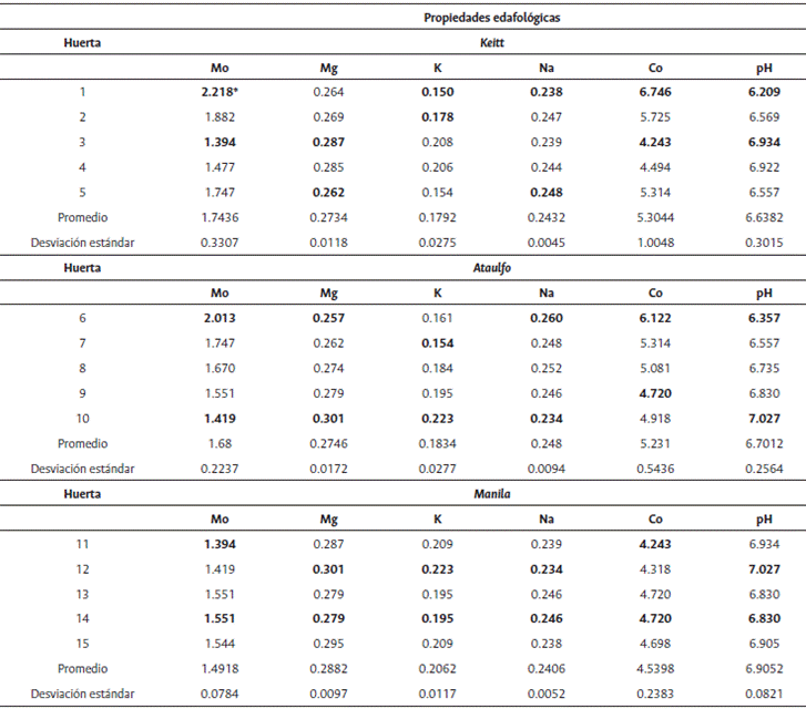 Las propiedades del suelo de las huertas de mango presentaron un rango superior al 2 % de materia orgánica, mientras que Mg y Na se mantienen estables, y K y pH se encontraron dentro del rango ideal para la producción (Tabla 3).