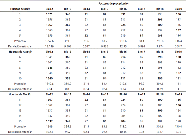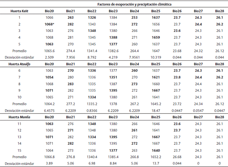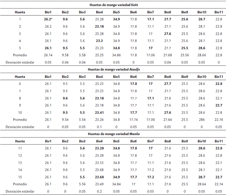 Los valores obtenidos de los parámetros bioclimáticos, como la evaporación (mm), la precipitación (mm) y la temperatura climática (°C) fueron específicos para cada variedad de mango, e incluyeron rangos fuera de la idoneidad climática para el cultivo (Tabla 6, señalados en negritas).