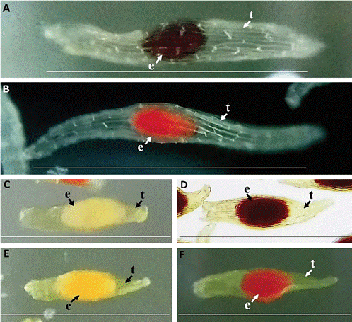 Figure 2: Viability assay using the tetrazolium test. (A and B) Non-viable and viable seed of S. plicata. (C and D) Non-viable and viable seed of Pleurotalis sp. (E and F) Non-viable and viable seed of Stelis sp. Scale bar = 1 mm. t: testa; e: embryo.