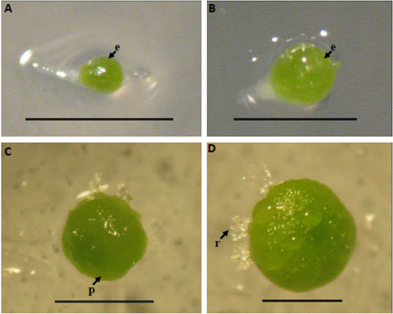 Figure 3: Asymbiotic germination of Pleurotalis sp. (A and B) Expanded embryo. (C) Protocorm formation. (D) Rhizoid production. (D) Scale of the bar = 1 mm. e: embryo; p: protocorm; ra: root; r: rhizoid t: testa.