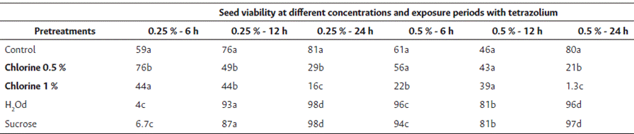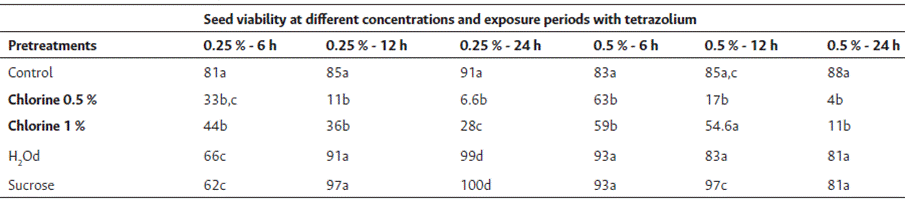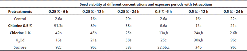 An increase in viability was observed with sucrose and deionized water pretreatments, both showing five maximum viability values that were similar to each other (Table 2). That is, pretreatments with sucrose and H2Od improved viability in all treatments except for tetrazolium exposure at 0.25 % for 6 h, where the pretreatment with 0.1 % chlorine presented the highest viability value.