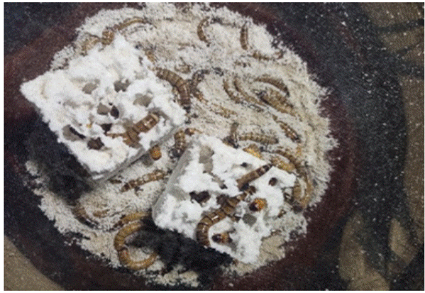 Figura 2: Larvas de Zophobas Morio consumiendo poliestireno expandido (EPS).