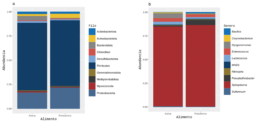 Se encontró que el género Spiroplasma fue el más abundante en la dieta del PS (86,49 %) y avena (84,15 %), , además, es considerado propio del tracto digestivo de los insectos de la familia Tenebrionidae.