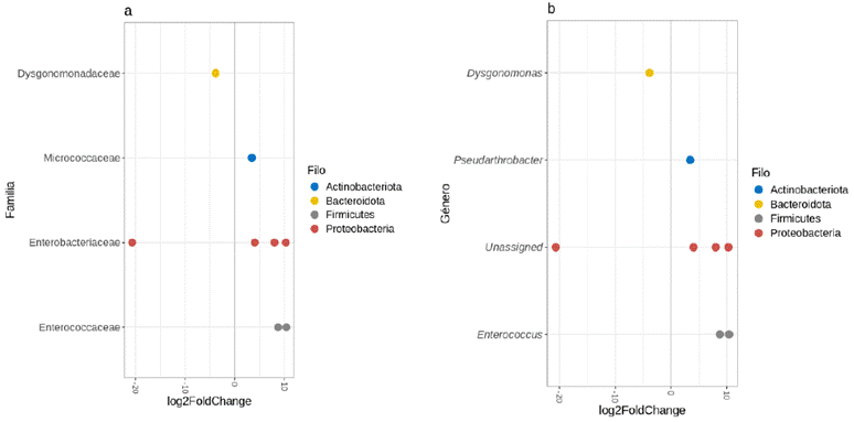 Figura 4: Análisis de abundancia diferencial a nivel de familia (a) y género (b) de microbioma según dieta de Zophobas morio (α = 0,01). Al lado negativo del log2FoldChange se encuentran las asignaciones diferenciadas para el control, mientras en el lado positivo está las de poliestireno.