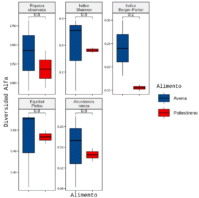 Los diagramas de caja y bigotes presentados para analizar los índices de diversidad alfa permitieron identificar que los valores del grupo control presentaron una mayor amplitud en sus datos, es decir, una distancia mayor entre sus valores mínimos y máximos (Figura 5). Lo anterior se confirmó al realizar el análisis de diversidad que indicó que el grupo control tuvo una mediana de 0,24, mientras la dieta de poliestireno una mediana de 0,17. A pesar de lo anterior, no se encontraron diferencias significativas entre ambos valores (p = 0,8 o p = 0,2).