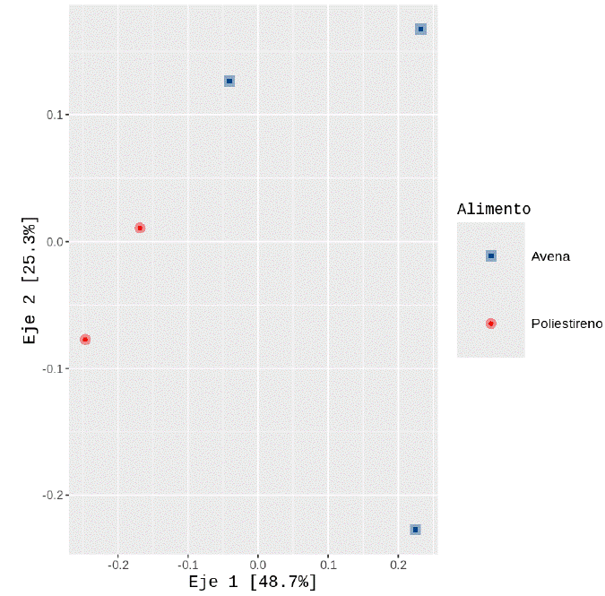 Al realizar el análisis de componentes principales PCoA (Figura 6), se observó que el eje 1 explicaba el 48,7 % de disimilitud, mientras que el eje 2 un 25,3 %, para un total de 74 % de variación. Se observa que las 2 muestras del grupo de poliestireno tienden a estar próximas; en cambio, las muestras de la dieta de avena presentan mayores distancias entre ellas. La cercanía entre las muestras de poliestireno puede explicarse por la abundancia y riqueza de bacterias que son más similares entre muestras de la dieta plástica, lo cual coincide con el análisis de abundancia diferenciada que permitió identificar taxones con diferencias significativas.