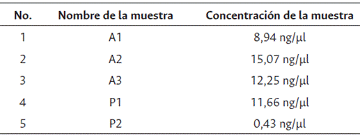 La integridad del ADN fue evaluada mediante electroforesis en gel de agarosa al 1 %, que contenía GelRed (Biotium®). La electroforesis se realizó en tampón TBE 0,5X a 100 V durante 30 minutos, utilizando una escalera de ADN de 1 kb como marcador de peso molecular (Thermo Scientific) (Tabla S1). La concentración e índices de pureza 260/280 y 230/260 fueron obtenidos con espectrofotómetro para microvolúmenes (Marca Titertek Berthold, modelo Colibrí, referencia 160208, producido en Alemania) (Figura S1). El ADN extraído fue almacenado a -80 °C para su posterior uso.
