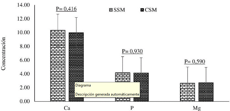 Figura 4: Concentración de calcio en suero y concentración plasmática de fósforo y magnesio. Calcio (Ca) en mg/dL; fósforo (P) en mg/dL y magnesio (Mg) en mg/dL. SSM: sin suplementación mineral inyectable; CSM: con suplementación mineral inyectable. Valor p < 0.05 denota diferencia significativa. Las barras representan el error medio estándar.