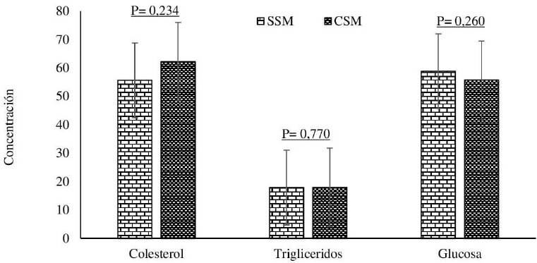 Figura 3: Concentración plasmática de metabolitos relacionados con el metabolismo energético. Colesterol en mg/dL; triglicéridos en mg/dL y glucosa en mg/dL. SSM: sin suplementación mineral inyectable; CSM: con suplementación mineral inyectable. Valor p < 0.05 denota diferencia significativa. Las barras representan el error medio estándar.