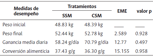 EME = error medio estándar; SSM = sin suplementación mineral inyectable; CSM = con suplementación mineral inyectable. Valor p < 0.05 denota diferencia significativa.