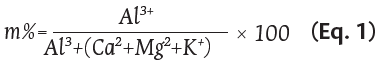 The following soil attributes were analyzed: pH in H2O; Al3+, Ca2+, and Mg2+ extracted with 1.0 mol L-1 KCl; potential acidity (H+Al) extracted with 0.5 mol L-1 Ca(CH3COO)2; organic matter (OM) determined using the Walkley-Black method; and remaining P (P-rem), assessed by stirring 60 mg L-1 P in a 0.01 mol L-1 CaCl2 solution (Teixeira et al., 2017). The sand, silt, and clay contents were determined according to Teixeira et al. (2017). The aluminum saturation was calculated as follows (Eq.1):