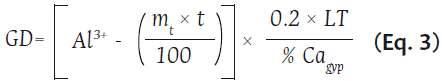 GD = gypsum dose, in tons per hectare (t ha-1); Al3+ = Al3+ concentration in the 20-40 cm layer, in mmolc dm-3; mt = tolerable Al3+ saturation (cocoa tree = 20 %); t = effective CEC in the 20-40 cm layer, in mmolc dm-3; LT = layer thickness (30 cm); %Cagyp = percentage of Ca in gypsum (16 %).