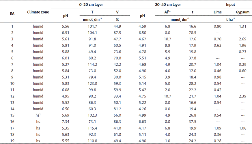 Table 1: Initial pH and chemical attribute* values used to calculate the lime and gypsum amendments for two soil layers and the respective lime and gypsum doses applied across nineteen experimental areas under cocoa cultivation, in the state of Bahia, Brazil