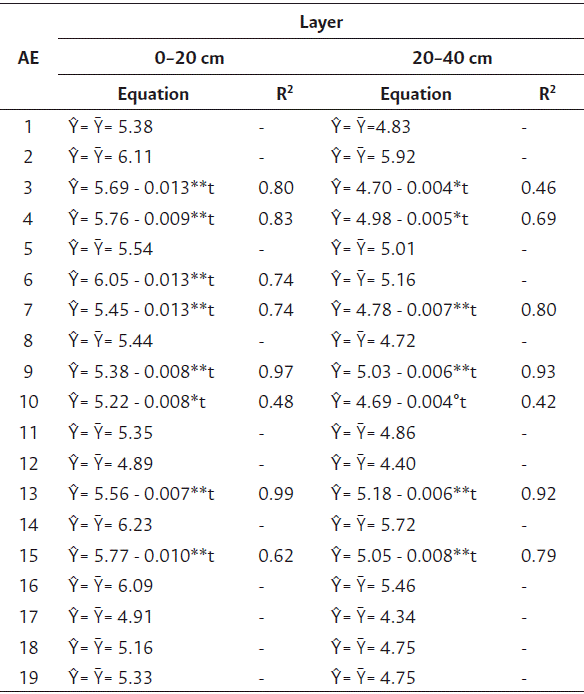 Table 2: Regression equations of pH variation over time* in two soil layers across nineteen experimental areas under cocoa cultivation in the state of Bahia, Brazil