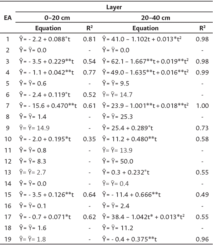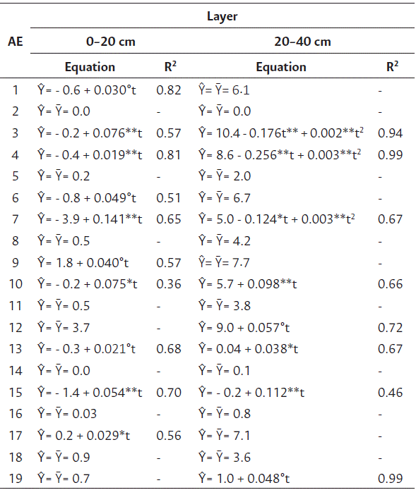 Table 4: Regression equations of Al3+ saturation over time* in two soil layers of nineteen experimental areas under cocoa cultivation in the state of Bahia, Brazil