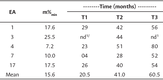 Aluminum saturation in the 20-40 cm layer varied over time in ten EAs (Table 5), increasing in five of them. In these EAs, gypsum was not applied. m% variation over time was described using a quadratic equation in the five EAs. All of them received gypsum amendments (Table 5 and Figure 2). The mean minimum m% (m%min) was 15.6 %, reached, on average, 41 months after applying gypsum.
