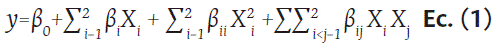 Donde y es la respuesta calculada por el modelo y son los coeficientes de regresión para el intercepto, términos de interacción lineales y cuadráticos, respectivamente; y es la variable independiente correspondiente a PA y AMM. El ajuste de los modelos se determinó mediante análisis de regresión y el coeficiente de determinación (R2). Igualmente, se realizó un ANOVA de medidas repetidas a un nivel de significancia de 0.05 para las propiedades fisicoquímicas y sensoriales; cuando estas fueron significativas se ejecutó la optimización simultánea de múltiples respuestas mediante la función de deseabilidad general (D), empleando el software estadístico Statgraphics Centurion XVI software (Versión 16.1.18).