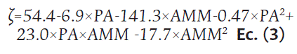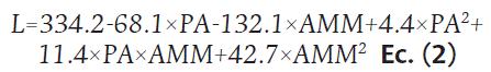 Respecto a los parámetros de color, el modelo cuadrático no puede explicar la variabilidad de los datos (p > 0.05) para las coordenadas a* y b* con la adición de PA y AMM (Tabla 3). Sin embargo, para L*, se identificó un modelo significativo (p < 0.05) descrito por la ecuación 2: