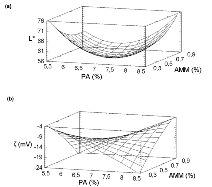 Por otro lado, el potencial zeta (ζ), que describe la magnitud de la carga eléctrica de las partículas y se ha utilizado como un indicador de la carga superficial de la caseína coloidal, se modeló cuadráticamente (p < 0.05) mediante la ecuación 3: