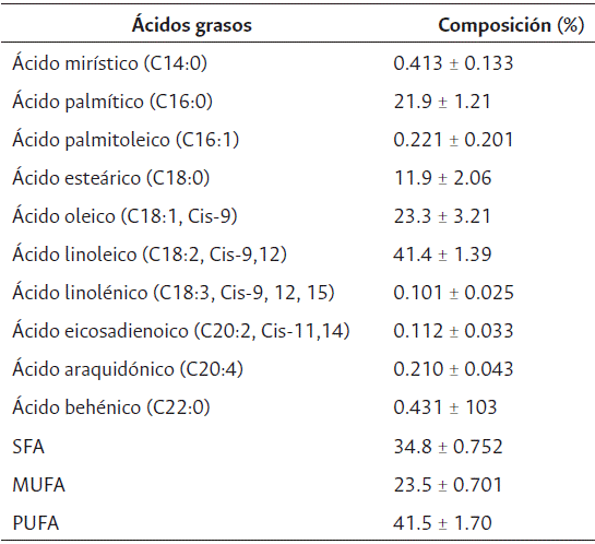La Tabla 1 muestra el perfil de ácidos grasos presentes en la HSA. Los principales componentes identificados fueron los ácidos linoleico, oleico, palmítico y esteárico, los cuales representan el 98.6 % del total de los ácidos grasos analizados. Entre los ácidos grasos insaturados, el ácido linoleico fue el más abundante, seguido por el oleico, palmitoleico y linolénico. Todos los demás ácidos (mirístico, eicosadienoico, araquidónico y behénico) estuvieron presentes en cantidades inferiores al 0.5 %.