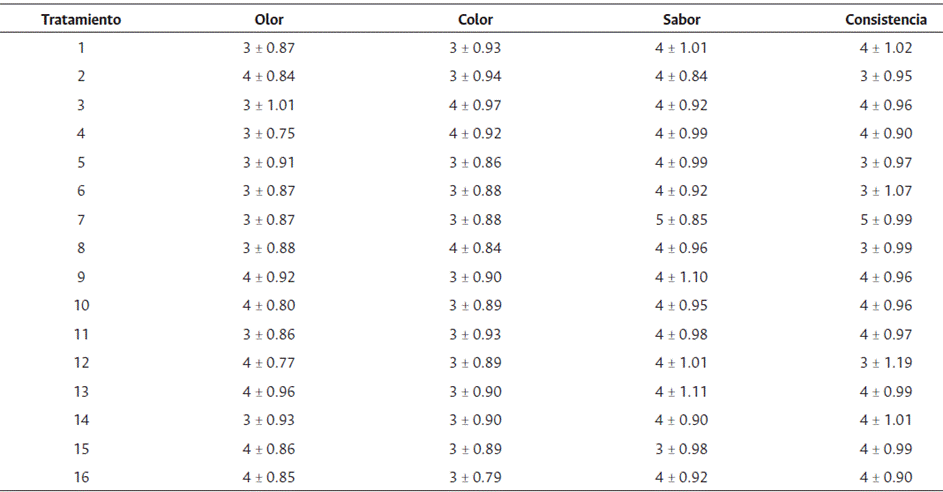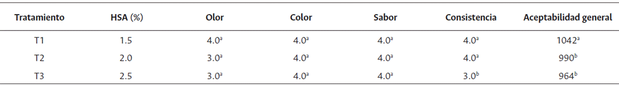 El perfil sensorial para los tratamientos evaluados se presenta en la Tabla 2. La prueba de Friedman evidenció una preferencia significativa por el tratamiento T1 (1.5 % de HSA) en comparación con T2 (2.0 % de HSA) y T3 (2.5 % de HSA). En términos de consistencia, se encontraron diferencias significativas entre T1 y T3 (p < 0.05), con un 75 % de los panelistas que calificaron T1 como “Me gusta mucho”, mientras que T3 recibió mayoritariamente la calificación de “Me gusta”. Para los atributos de olor, color y sabor no se identificaron diferencias significativas entre los tratamientos evaluados (p > 0.05). Cabe destacar que el tratamiento T1 obtuvo una puntuación promedio de 4 en todos los atributos, por lo que se seleccionó para continuar con la siguiente fase de la experimentación.