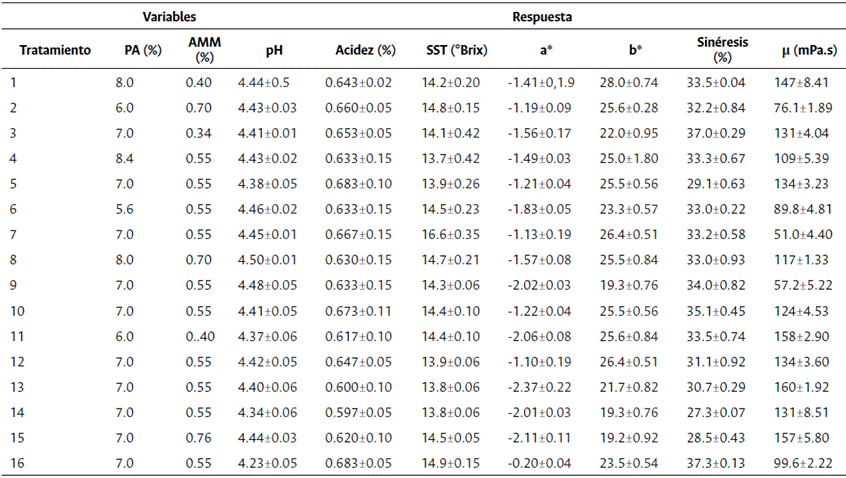 En cuanto a la sinéresis y viscosidad, el modelo cuadrático no fue significativo (p > 0.05) para explicar la variabilidad en función de las concentraciones de PA y AMM. Para la sinéresis, los valores obtenidos oscilaron entre 27.3 % y 37.3 %, mientras que para la viscosidad se registraron entre 50.9 y 159.5 MPa.s (Tabla 3).