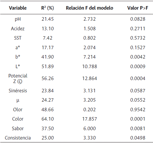 Los datos experimentales (Tabla 3) permitieron determinar el coeficiente de determinación (R2), la relación F del modelo y el valor P (Tabla 4). El modelo cuadrático no fue significativo (p > 0.05) para las características fisicoquímicas, como pH, acidez y SST, con la adición de PA y AMM (Tabla 3). El pH se mantuvo entre 4.2 y 4.5, los valores de acidez entre 0.6 y 0.7 % (expresados como ácido láctico) y los SST entre 13.7 a 16.6 °Brix.