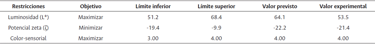 Para la validación de la BLF con las variables estadísticamente significativas (p < 0.05), las concentraciones óptimas de PA y AMM fueron y 0.3 % (p/p), respectivamente. Los valores experimentales de ζ y color evaluado sensorialmente fueron congruentes con los valores previstos del modelo (Tabla 6); la formulación optimizada presentó buena estabilidad (umbral de aglomeración bajo) y mantuvo la calificación de sus atributos sensoriales por los panelistas en la categoría “Me gusta”. Sin embargo, se observó una discrepancia en el valor de L* debido a la mayor concentración de PA utilizada.