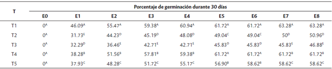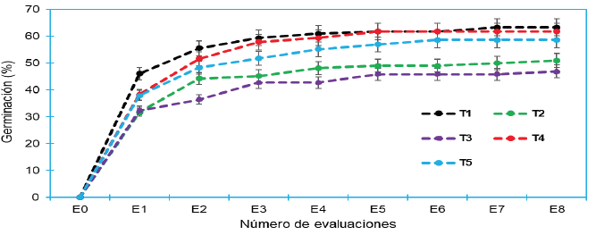 Durante 30 días de evaluación, el porcentaje de germinación (%G) de semillas de G. crinita fue mayor en el tratamiento T1, con 46.09 %, 55.47 %, 59.38 %, 60.94 %, 61.72 %, 61.72 %, 63.28 %, 63.28 % para las 8 evaluaciones. Por otro lado, el tratamiento T4 mostró un comportamiento similar al T1 en la quinta evaluación (15 días), en la que ambos fueron estadísticamente semejantes (60.94ª; 61.72ª), aunque difirieron con el transcurso del tiempo en las evaluaciones posteriores, como se detalla en la tabla 2.