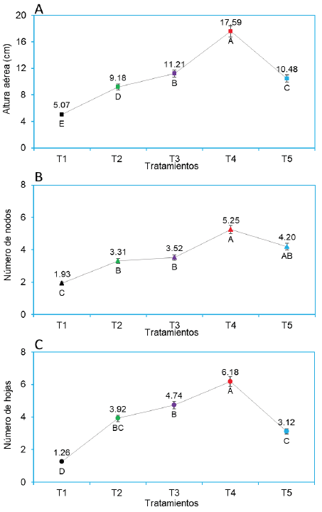 El efecto del medio de cultivo en la altura parte aérea (HP) mostró diferentes respuestas para cada tratamiento. El tratamiento T4 (WPM 100 %) obtuvo el mayor crecimiento (17.59 cm/planta), mientras que el tratamiento T1 mostró el menor crecimiento (5.07 cm/planta) (figura 2A). En cuanto al número de nodos (NN) (figura 2B), los tratamientos T4 y T5 presentaron los valores más altos (5.25 y 4.20 nudos/plantas, respectivamente), mientras T1 obtuvo los valores más bajos (1.93 nudos/plantas). En relación con el número de hojas (NH) (figura 2C), T4 obtuvo mayor número de hojas (6.18 hojas/ plantas), mientras T1 obtuvo los valores más bajos (1.26 hojas/plantas). Por otro lado, los tratamientos T2, T3 y T5 mostraron valores intermedios para todas las variables estudiadas sin diferencias estadísticas entre ellas, excepto para la variable NN, cuyos valores intermedios fueron obtenidos en T2 y T3.