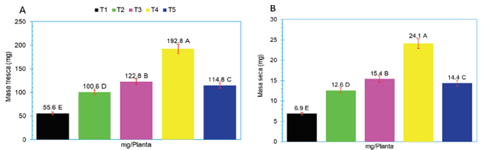 Los resultados de producción de masa fresca y seca (MF y MS) indicaron diferencias entre los tratamientos (figura 3a y b). El tratamiento T4 mostró los mayores valores numéricos en MF y MS, con 192.8 mg/planta y 24.1 mg/planta, respectivamente. Por otro lado, el tratamiento T1 registró los valores numéricos más bajos de MF y MS para ambas variables (55.6 y 6.9 mg/planta, respectivamente). Mientras tanto, el tratamiento T5 obtuvo valores intermedios (114.8 y 14.4 mg/planta, respectivamente), como se muestra en la figura 3a y b.