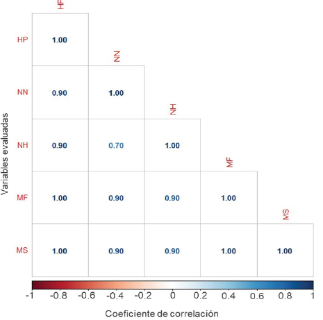 El análisis de correlación entre las variables identificó correlaciones positivas absolutas (1 ***) entre HP y MF, HP y MS y MF y MS (figura 4). Resultados similares fueron reportados por Gonzales-Alvarado y Cardoso (2024); Sarropoulou et al. (2023)); Bello-Bello et al. (2016) en especies de Melaleuca alternifolia, Cereza y Vanilla planifolia, respectivamente, quienes observaron altas correlaciones positivas entre las variables analizadas. Estos hallazgos subrayan la importancia de la correlación entre la altura de la planta y la masa fresca y la masa seca, la cual refleja el crecimiento y desarrollo saludables de las plantas en medios de cultivos apropiados para esta especie, como es el WPM.