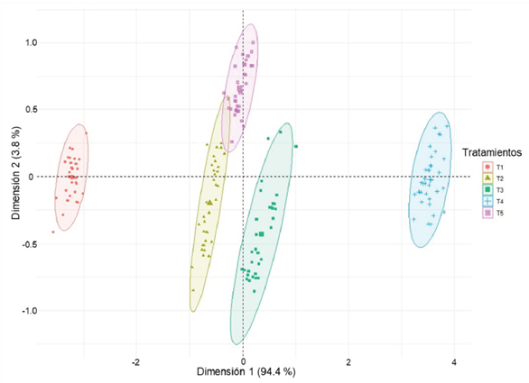 El análisis de correlación identificó 10 correlaciones, todas positivas. 9 correlaciones mostraron valores iguales o superiores a 0.90. Específicamente, las variables HP y MF; HP y MS; MF y MS presentaron valor absoluto de correlación de 1 ***, lo que indica una correlación perfecta entre ellas (figura 4). Por su parte, el análisis del PCA reveló distintos agrupamientos para cada uno de los tratamientos, con 94.4 % de la variación explicada por la primera dimensión (figura 5).