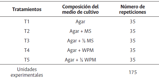 Como medios de cultivo se utilizaron las formulaciones de Murashige y Skoog (1962), y Lloyd y McCown (1980) (Murashige y Skoog [MS] y Woody Plant Medium [WPM], respectivamente) a diferentes concentraciones. Se aplicaron 5 tratamientos (tabla 1) que son los siguientes: 100 % MS (T2), 50 % MS (T3), 100 % WPM (T4), 50 % WPM (T5) y el testigo (T1) sin ningún medio de cultivo. En todos los medios de cultivo se agregó 7 g L-1 de agar (PhytoTech) y 30 g L-1 de sacarosa. Así mismo, para cada tratamiento, se ajustó el pH a 5.8.