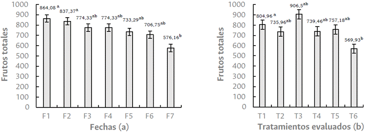 Los frutos totales analizados indican que en la primera fecha de muestreo (06 de octubre 2023) se contabilizó la mayor cantidad de estos y que se presentó una reducción en las diferentes fechas, con lo cual se observó, al final de los muestreos (20 de enero 2024), que la plantación contaba con menor cantidad de frutos totales; a su vez, el testigo mostró el menor número de frutos para cosechar (Figura 1). Esto se atribuye a que el grano de café presenta las condiciones óptimas para el corte en esta zona del país.