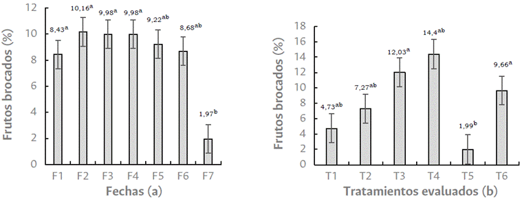 Al analizar el comportamiento de la afectación de broca en los frutos de cafeto, se observó que en la fecha 2 (mes de octubre) ocurrieron las mayores afectaciones, cuando los frutos de café presentaron semiconsistencia, por lo cual la broca puede penetrar los granos; el tratamiento 4 seguido del tratamiento 3 registraron los mayores porcentajes; y en el tratamiento 5 se registraron los menores porcentajes de frutos brocados (Figura 2).