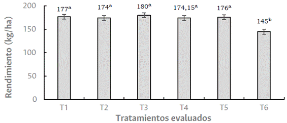 Al analizar los tratamientos evaluados, se observó que los rendimientos fueron estadísticamente iguales con excepción del testigo, que fue el que presentó el menor rendimiento (T6) (Figura 4).