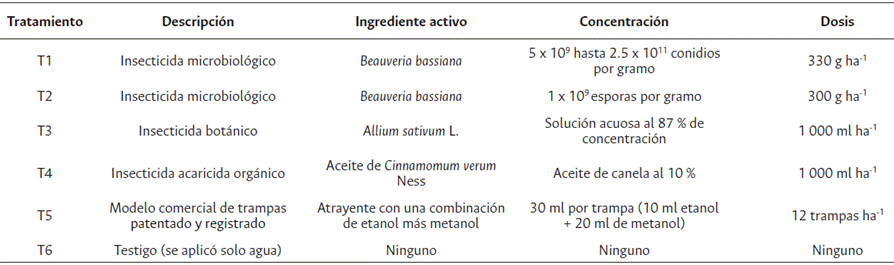 El estudio fue experimental longitudinal, empleando un diseño en campo de bloques completos al azar, con 4 réplicas, y evaluando 4 alternativas a base de hongos entomopatógenos y extractos botánicos comparados con un manejo cultural y un testigo absoluto (Tabla 1). El ensayo constó con 2 520 plantas de cafeto, distribuidas en 4 bloques de 840 m2 cada uno (180 m2 por parcela experimental). Con una distancia de dos metros entre bloques, para un total de 3 360 m2 en el experimento.