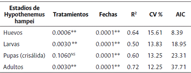 Los frutos diseccionados mostraron diferencias significativas para los tratamientos y fechas (Tabla 2), el uso de trampa (tratamiento 5), presentó la menor población promedio de huevos, larvas, pupas y adultos, método de control que es muy utilizado por los productores para mantener la población de broca en niveles bajos. En la primera fecha de muestreo fue en la que se registró la mayor población promedio de estadios de desarrollo de broca de café en los granos perforados y diseccionados; esto se debió a que las hembras emergieron de frutos caídos en busca de frutos de café óptimos para perforarlos, alimentarse y colonizarlos (Tabla 3).